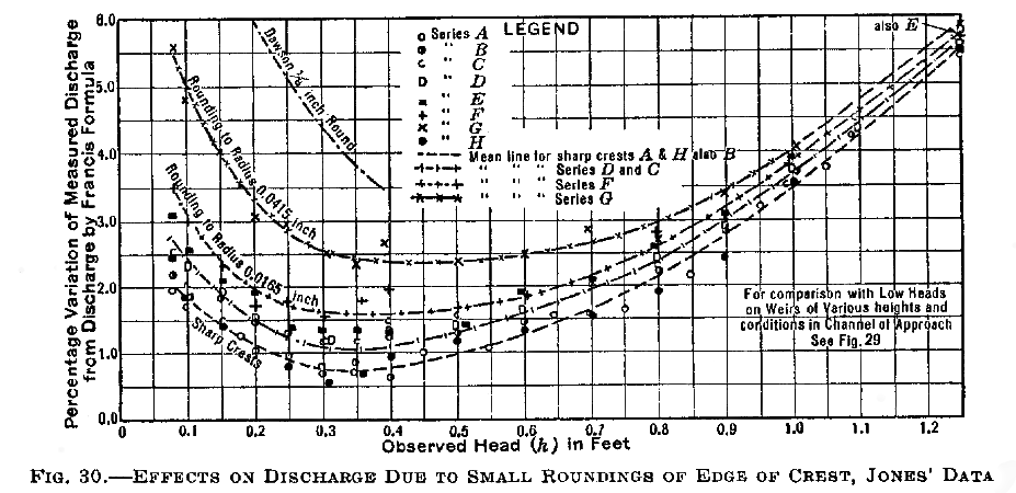 Jones found that for crest radii up to 1/8-inch [0.3175 cm] the rounding increases the discharge in direct proportion to the radius, and the percentage effect decreases as the head increases. This is to be expected as small variations in flow or installation conditions at low heads should naturally be expected to have a greater influence than at greater heads.