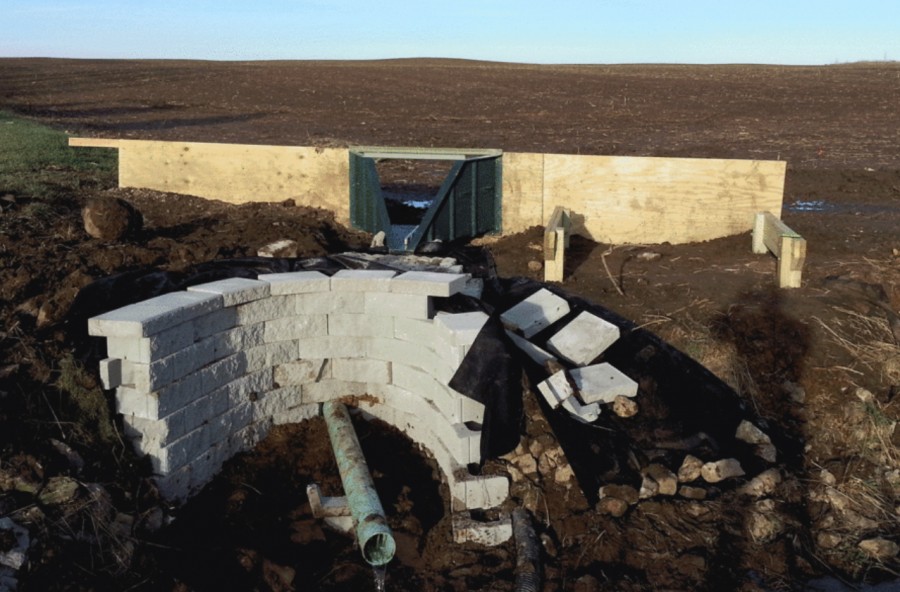 Creating an edge-of-field monitoring site with a H flume, inlet wing walls, and a down stream subsurface tile monitoring site.